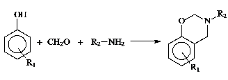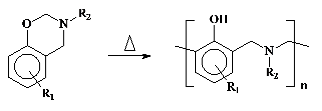 low moisture absorption, good mechanical properties and excellent dimensional stability. Polybenzoxazines are obtained by ring opening polymerization of the corresponding monomers at elevated temperatures without catalysts and releasing by-products according to the following reaction.