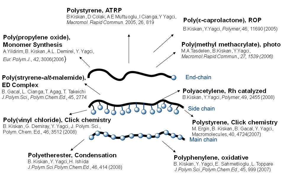 This flexibility provides possibility of synthesizing a wide range of benzoxazine monomers with additional functionalities such as acetylene, nitrile, propargyl and maleimide groups. The incorporation of benzoxazine groups into polymers is an alternative way to further improve the properties. The benzoxazine groups act as thermal crooslinker and while the polymer may be accountable for the flexibility of these materials. Thus, thermally crosslinked non-brittle polybenzoxazine films can be prepared. In this paper, we describe our synthetic approaches proposed to prepare benzoxazine functional polymers. The incorporation of benzoxazine groups into polymers can proceed through two main synthetic routes;