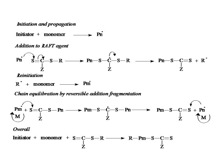 The active species, such as the radicals stemming from the decomposition of the initiator and propagating radicals (Pn.), are transferred to the RAFT-agents, e.g. the thiocarbonylthio moiety. Meanwhile, an intermediate radical is formed, and undergoes a fast fragmentation reaction, giving a polymeric RAFT agent and a new radical. The radical reinitiates the polymerization. The equilibrium is established by successive chain transfer-fragmentation stages. Z and R groups in the thiocarbonylthio compound represent the activating group and homolytically leaving group, respectively. These, in turn, determine the rates of addition and fragmentation. As a matter of fact, the choice of RAFT agent for a specified monomer is rather significant and affects the degree of control.