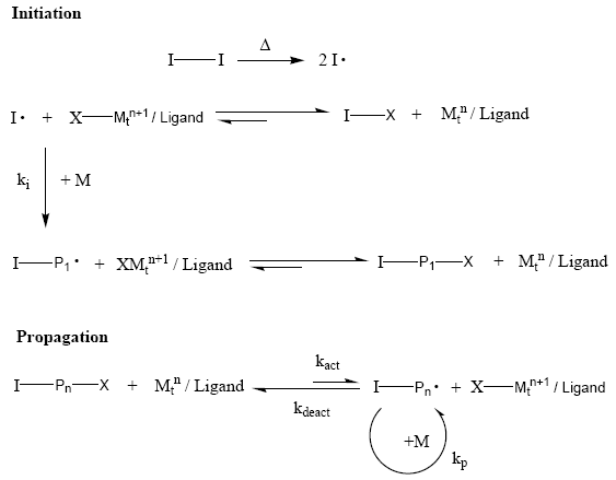 Reverse ATRP differs from ATRP in its initiation process, where a conventional radical initiator, such as AIBN (2,2’-Azobisisobutyronitrile), is used. As shown below, in the initiation step, once generated, the initiating radicals or the propagating radicals, I. Or I-P., can abstract the halogen atom X from the oxidized transition-metal species, XMtn+1, to form the reduced transition-metal species, Mtn, and the dormant species, I-X or I-P1-X. In the subsequent steps, the transition-metal species, Mtn, promotes exactly the same ATRP process as normal ATRP where R-X/Mtn/Lx are used as the initiation system. Instead of first activation of a dormant species, R-X, with Mtn, as in the case of normal ATRP, reverse ATRP originates from the deactivation reaction between radicals, I. or I-P., and XMtn+1.