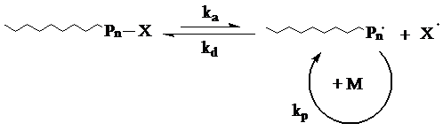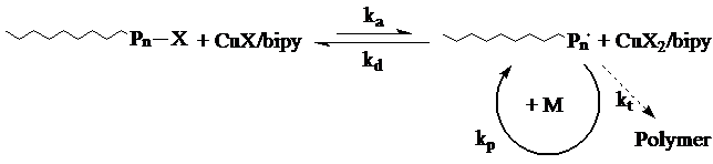 Atom Transfer Radical Polymerization, pioneered by Matyjaszewski and Sawamoto, is based on a continuous and reversible halogen transfer (pseudo halogen) between a dormant propagating species, Pn, and a transition-metal (eg. Cu), complexed by a ligand (eg. bipy), in its lower oxidation state (Scheme 6). Halogen transfer is accompanied by a one-electron oxidation of the transition metal, whereby propagation takes place by the addition of monomers to the activated chains. Homogeneity of the polymeric chains is controlled by the fast and simultaneous initiation as well as rapid deactivation of the growing chains. Here, the rate of deactivation should be faster than the propagation rate for an effective control. Low concentration of the active centers, maintained by deactivation, suppresses termination and chain transfer reactions at later stages