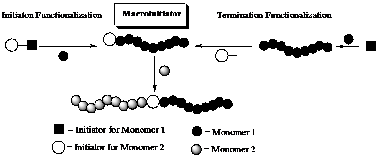 On the other hand, blocks of polymers synthesized by distinct polymerization mechanisms can be combined by special reactions such as “click” reactions. In such coupling process, a pair of antagonist groups such as azide-alkyne or anthracene-maleimide that react with other antagonist of pair on the other polymer chain. In other words, the coupling reaction occurs via specially prepared groups introduced to chain end rather than active sites of the living polymers and therefore named as indirect coupling. The antagonist groups can be attached onto polymers by post modification or utilization of heterofuntional initiators.